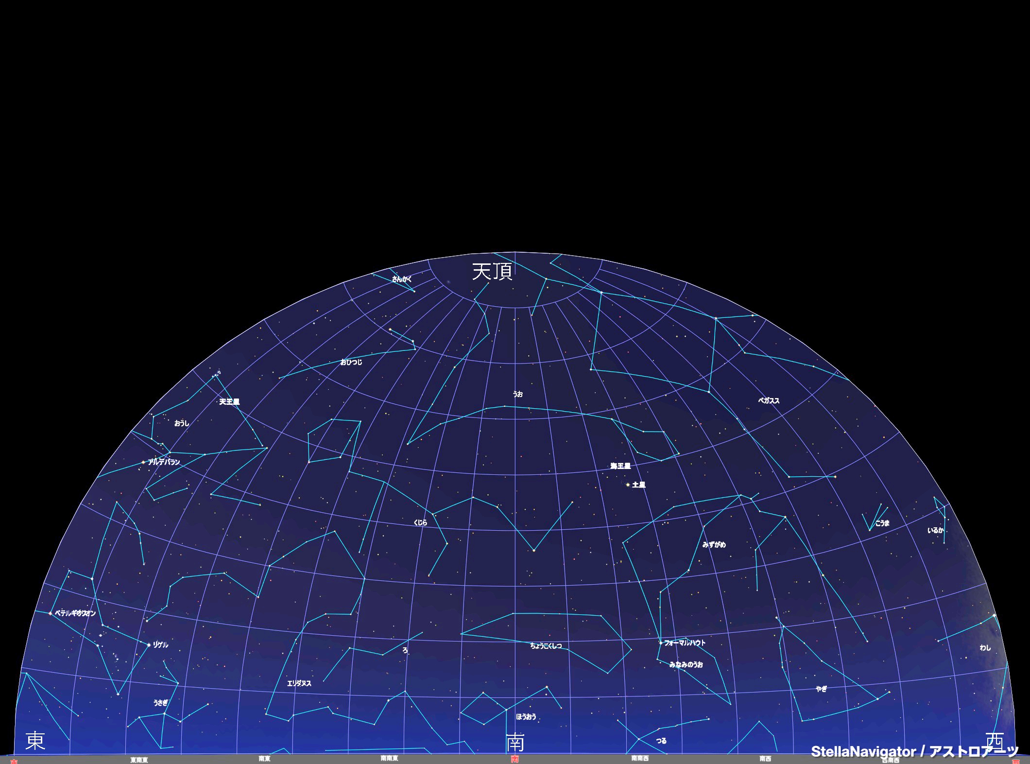 土星は、みずがめ座の中に輝いて見えますが、11月は観測の条件が良く、土星本体と細い環の姿を天体望遠鏡で見ることをおすすめします。