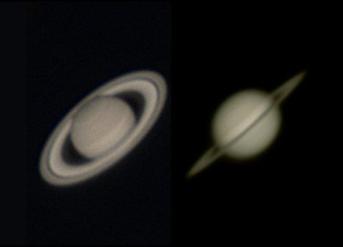 土星の環が開いて見えるときの形状とほぼ真横に近い位置から見える形状。今年は右側の環がほぼ見えない形状に近い。なお、この写真は本年3月号、5月号でも掲載している写真です(撮影:石川勝也)。