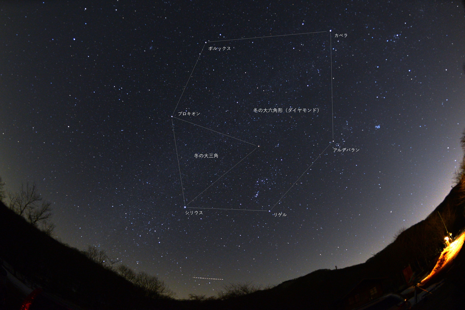 冬の星座にある1等星を結んでできる大きな六角形を冬の大六角形または冬のダイヤモンドと呼んでいます。じっさいの空で確認してみましょう。(画面をクリックするとさらに大きな画面で見られます。)