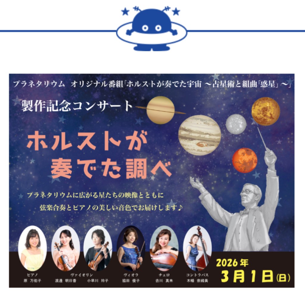 プラネタリウム新オリジナル番組「ホルストが奏でた宇宙 ~占星術と組曲『惑星』~」の製作を記念して生演奏によるコンサートを実施します。