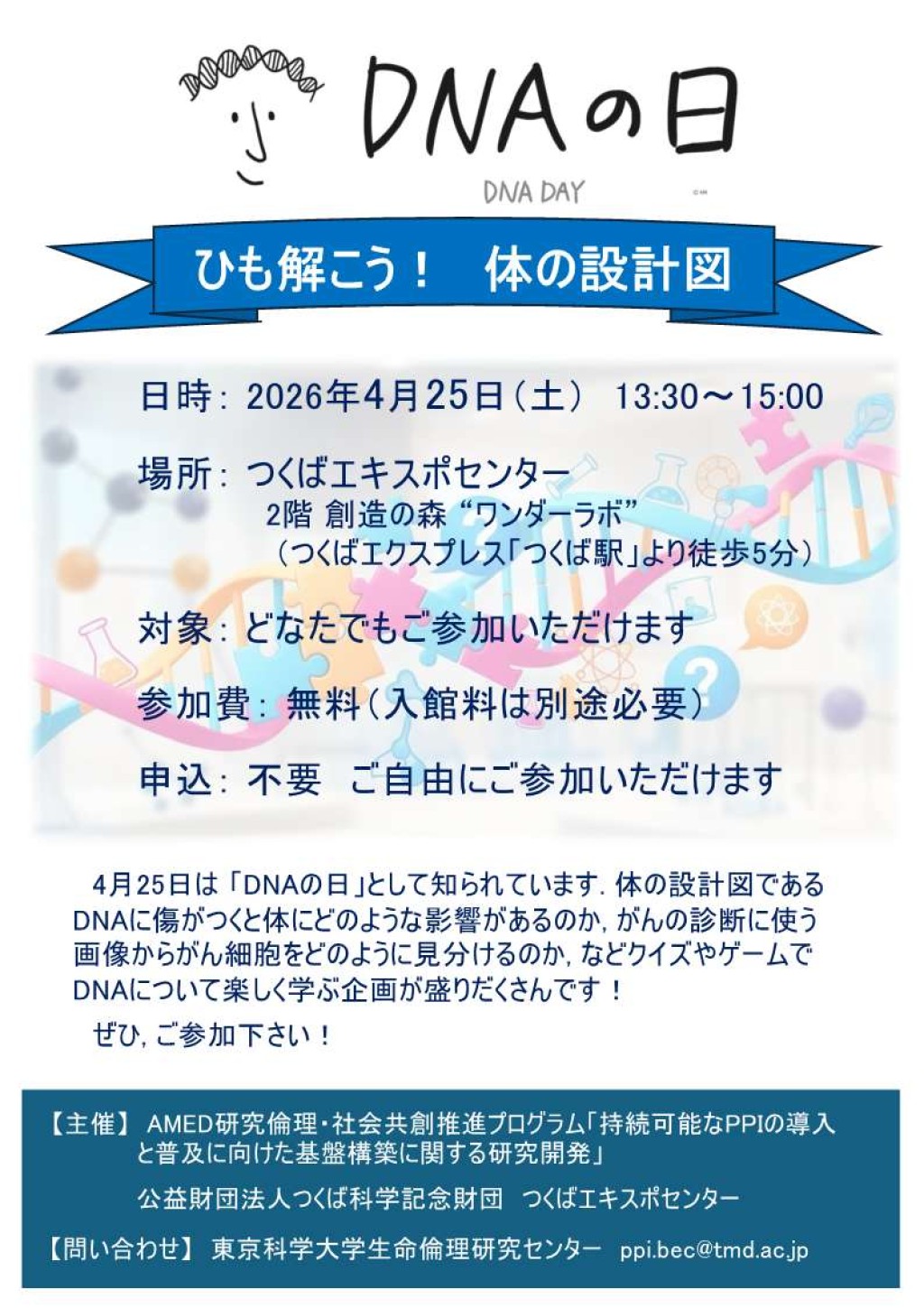 4月25日は 「DNAの日」として知られています。体の設計図であるDNAに傷がつくと体にどのような影響があるのか、がんの診断に使う画像からがん細胞をどのように見分けるのか、などクイズやゲームでDNAについて楽しく学ぶ企画が盛りだくさんです!