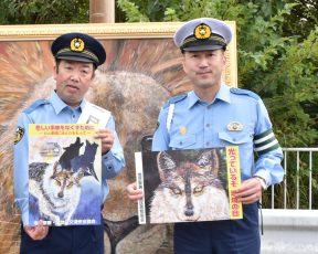 同町在住の画家、中村和美さん(54)を一日署長に委嘱した。中村さんが描いた啓発チラシを配り、交通事故防止や防犯を呼びかけた。