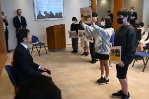 小美玉市立小川北義務教育学校の5年生が、県庁を訪れ、大井川和彦知事に自分たちで育てたコシヒカリ「OK米」を贈呈した。