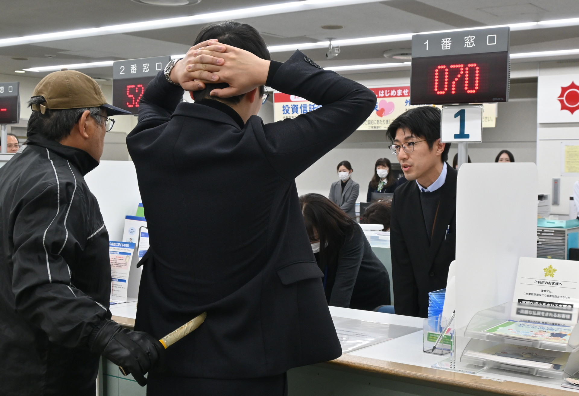 取手地区金融機関防犯連絡会連合会と取手警察署は、取手市の常陽銀行取手支店で強盗とニセ電話詐欺の対応訓練を実施した。署員らが犯人役と被害者の高齢者役を務めた。