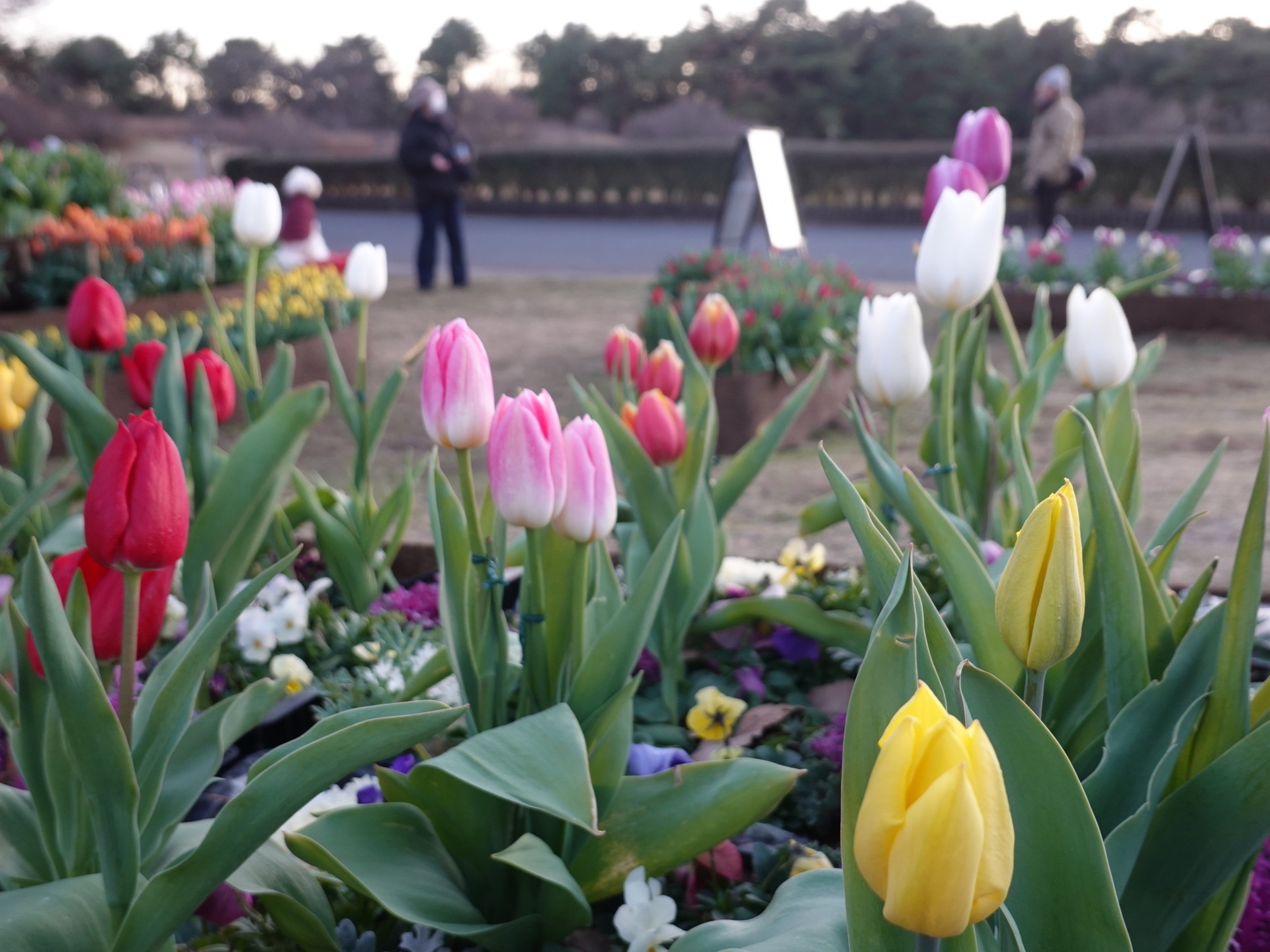 球根を低温処理することで「春が来た」と錯覚させて咲かせたチューリップで、冬枯れの季節の園内に彩りを与えている。