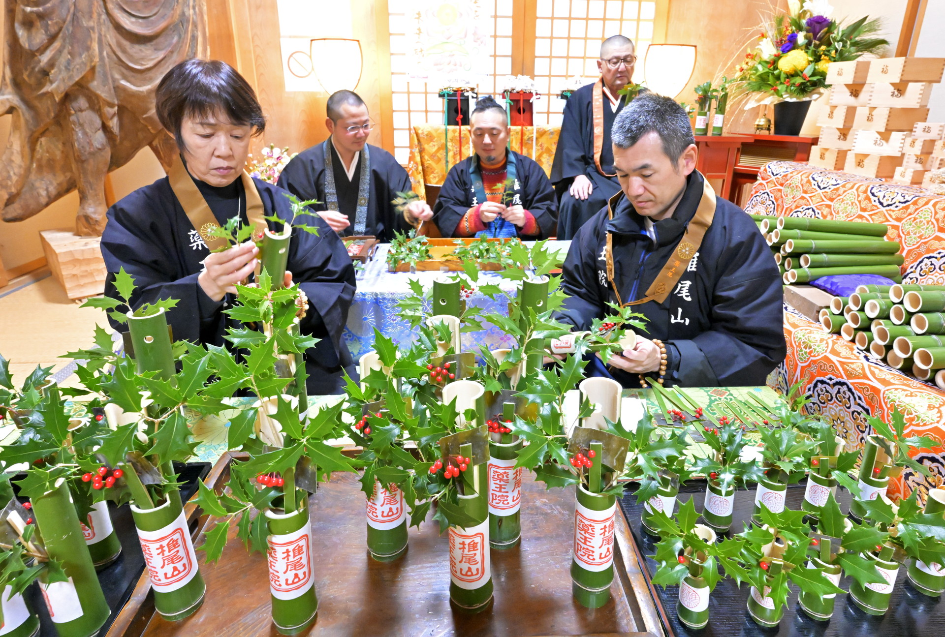 僧侶らはヒイラギと昆布を青々とした竹筒に挿し、マンリョウの赤い実を添えて一つ一つ丁寧に作り上げている。