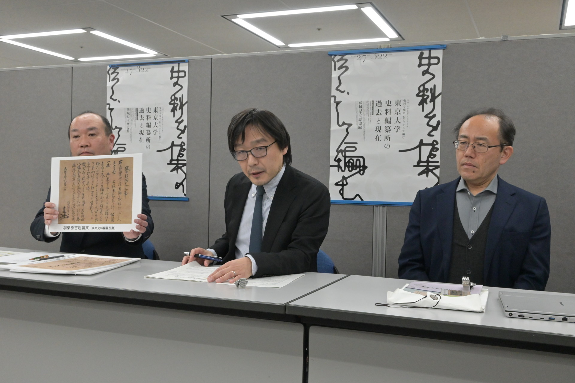 豊臣秀吉の誓約状が2月7日から、県立歴史館(水戸市緑町)の企画展で全国初公開される。昨年10月に誓約状を発見した東京大史料編纂所(東京)が20日、同展を共催する同館とともに県庁で記者会見を開いた。