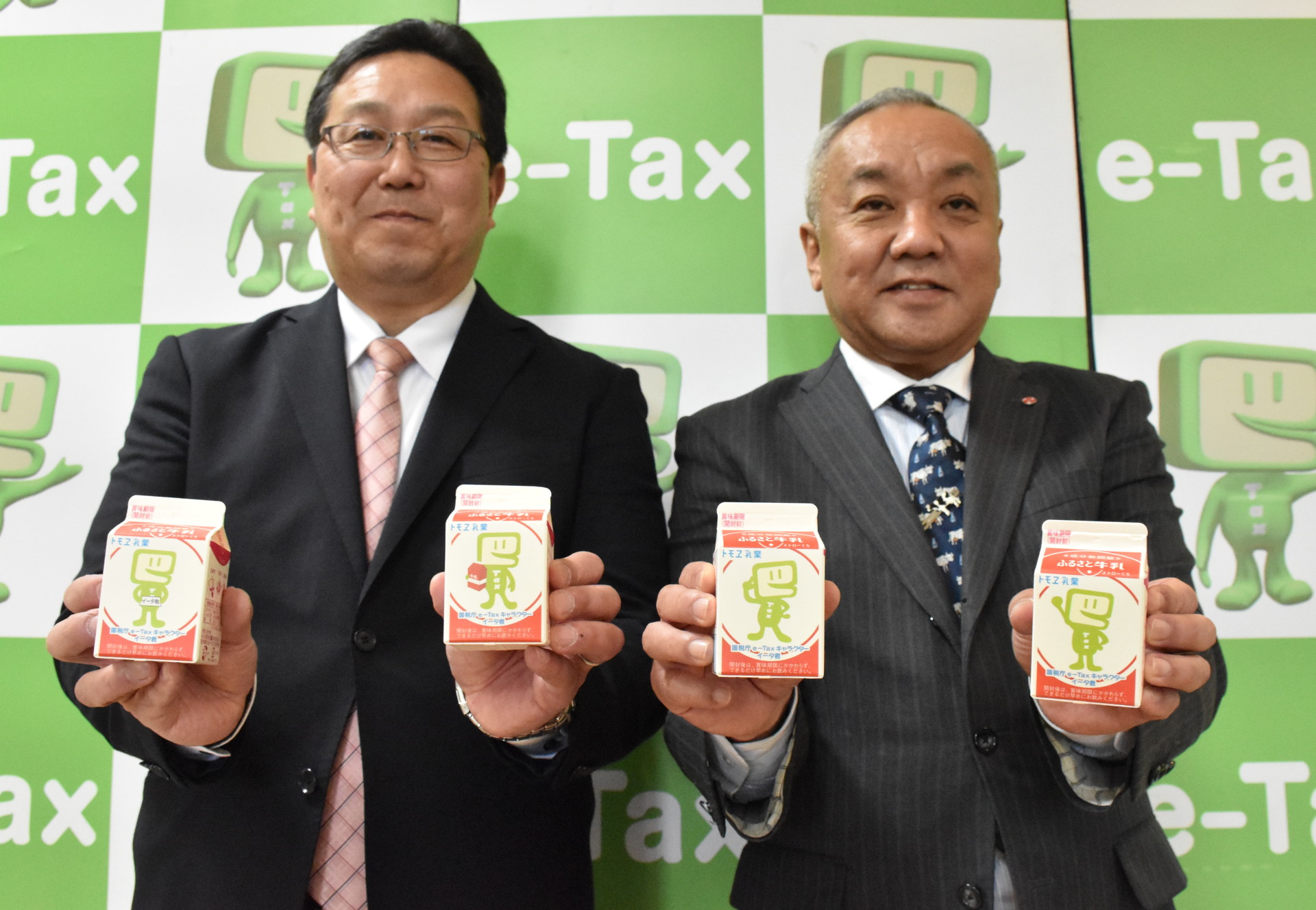 小中学生が税について考えるきっかけにしてもらおうと、古河税務署(藤田研二署長)は、古河市下辺見の乳製品メーカーのトモエ乳業(中田俊之社長)と協力し、国税庁の電子申告・納税システム(e―Tax)のイメージキャラクター「イータ君」がデザインされた給食用の牛乳パックを作った。