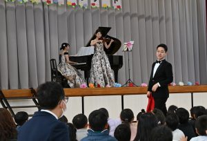 守谷市立松ケ丘小(同市松ケ丘)で、体育館の大規模改修工事の完了を祝って、卒業生の音大生ら3人がこけら落としコンサートを開いた。