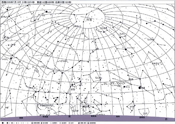 ところで、織姫星(こと座のベガ)と彦星(わし座のアルタイル)は、7月中旬ころでどのあたりに見られるでしょうか。星図をたよりに確かめてみてください。夜の10時ころにはこと座のベガはほぼ天頂に近い位置に見られます。わし座は天の川をはさんで反対側にありますので、光害(ひかりがい)の少ない場所で、ぜひ確かめてみましょう。